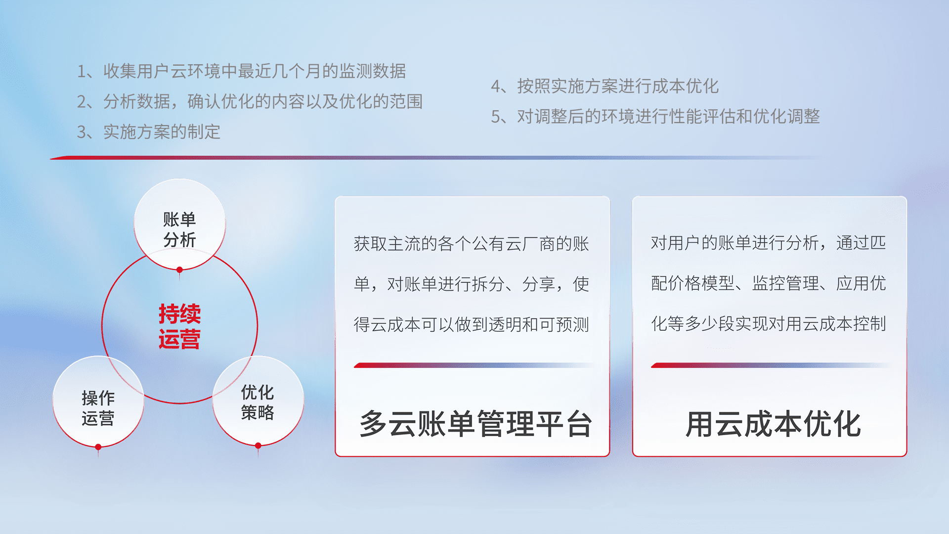 通过多云纳管,,,以统一的资源数据模型把客户的云资源进行抽象和封装,,,进而实现对多云资源的统一操作,,,保障云资源管理的可靠性、、、稳定性与可用性。。。。量身定制化运维内容,,,,配置、、开发运维、、补丁管理、、、备份、、监控、、、认证和访问管理、、、审计和日常巡检等,,,,保障在用云过程中的可靠度,,,稳定度以及高可用率。。。