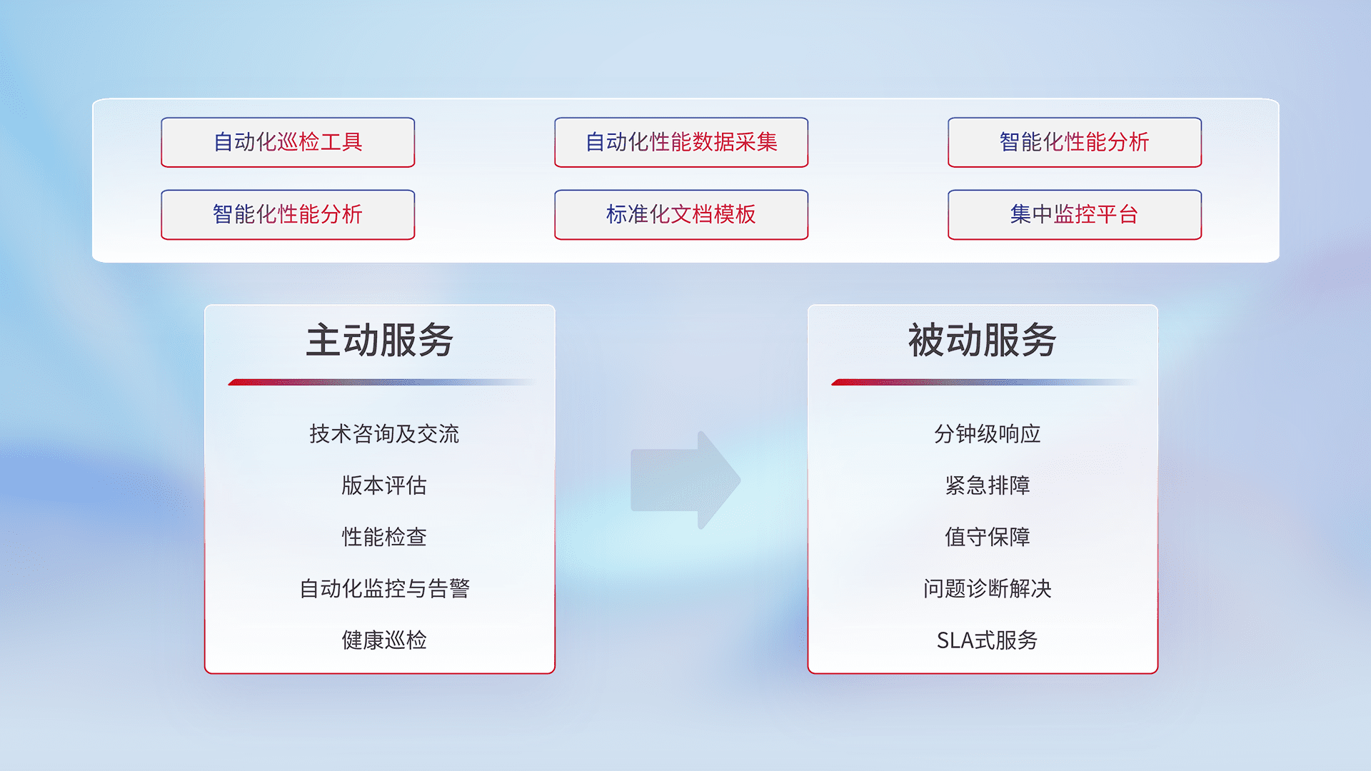 智能化工具和标准化文档,,,,保障服务质量,,,,提供主动服务(包含技术咨询、、、版本评估、、、、性能检查、、、、自动化监控与告警、、、、健康巡检)和被动服务包含(分钟级响应、、、、紧急排障、、、、值守保障、、问题诊断解决、、SLA服务)。。。